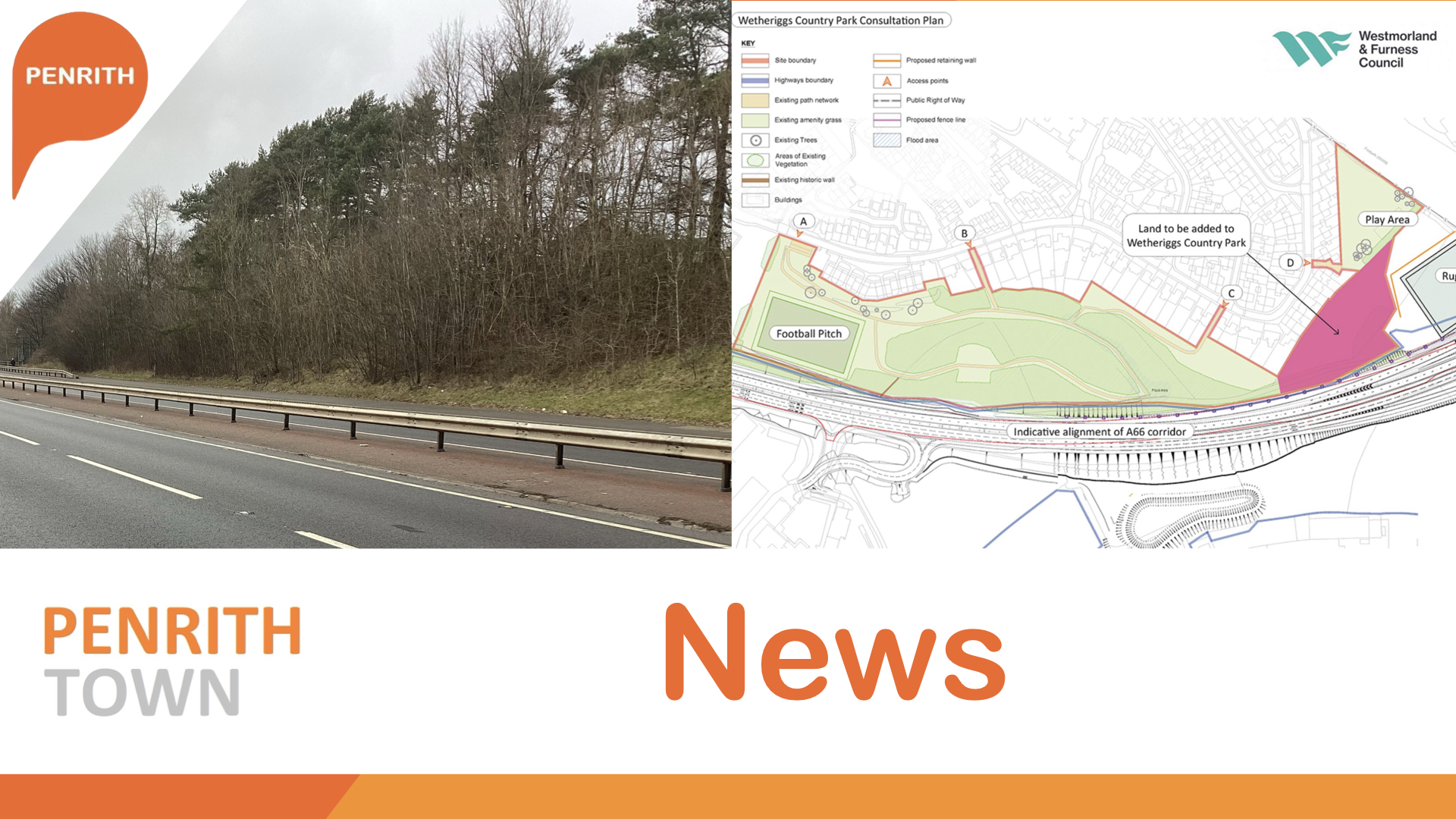 The A66 upgrade along the section between J40 and Kemplay Roundabout will see parts of the existing park area used with part of the existing tree line lost and land along the edge of the park land. National Highways have purchased a plot of land at the eastern edge of Wetheriggs Country Park to offset the strip of land that will be used that will form part of the councils Masterplan development.