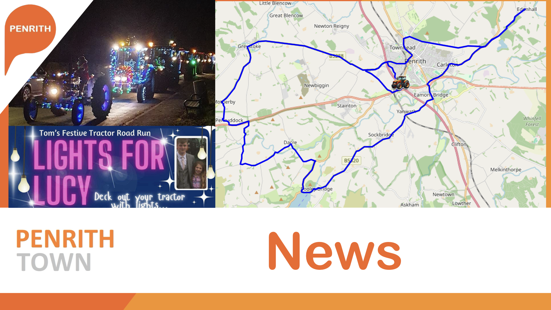 Tractors taking part in the Lights for Lucy festive tractor run will be covered in lights and festive decorations for the charity tractor run that will pass through parts of Penrith and local villages with the tractor convoy departing from Penrith auction at 4pm travelling through the following villages: